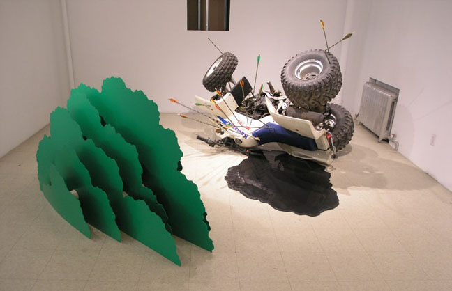 Renowned for cheeky, critical and explosive works, BGL creates self-referential, site-specific installations that seek to re-contextualize the space of the gallery. These artworks are at once nostalgic, while simultaneously indebted to contemporary culture. The trio often utilizes local signage, foodstuffs and urban clichés as references into a long-term investigation of our own unpredictable relationship with nature and consumer culture. Within BGL’s playful scenarios, we are able to witness the transformation of the Canadian landscape: an ongoing battle between the organic and the artificial. As a result, the viewer becomes more aware of their personal implication in a disposable consumer culture. This is precisely what BGL is engaging with in their artistic practice: a process of recycling and reusing that is then restaged and recontextualized within the gallery space. The collective’s massive exhibitions have included the staging of a seasonal ornamental tree factory, a bonfire and even a ‘Marché aux puces’ (flea market). Such works reposition found objects, cultural ephemera and unique sculptures in new and thought-provoking ways.