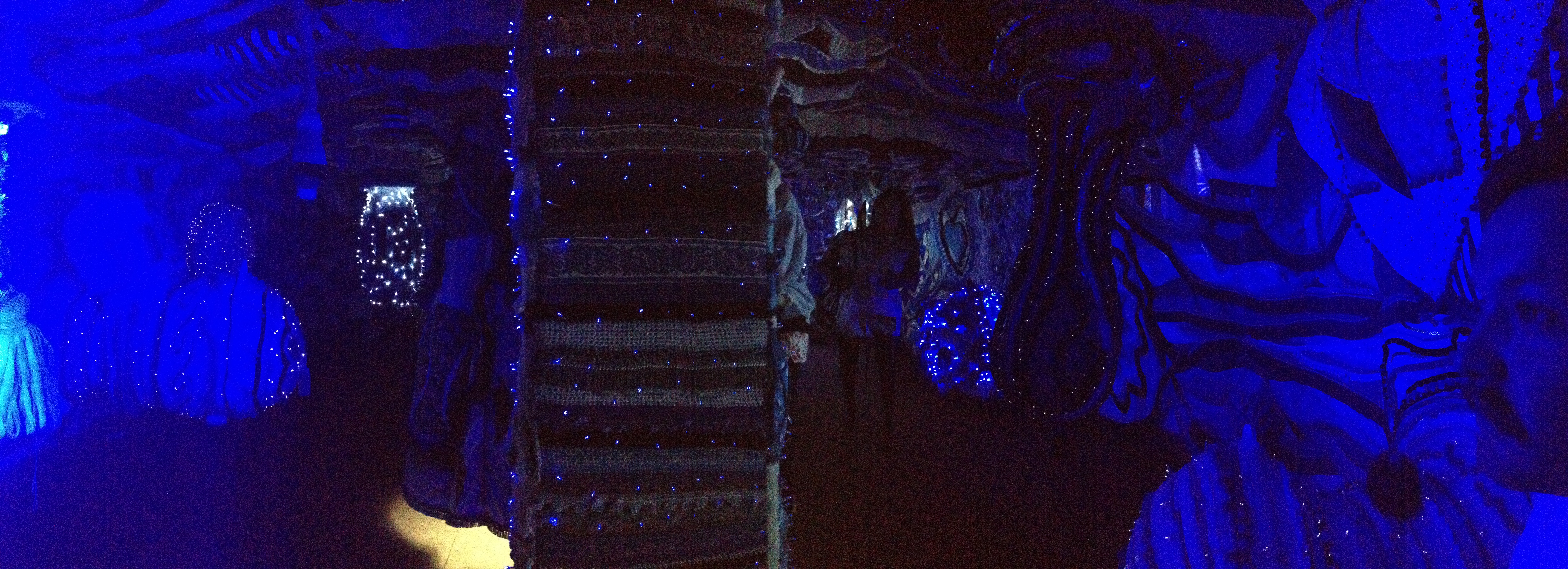 Upon entrance into the lower level, we were enveloped into an environment akin to a visceral representation of the interior of the human body, as well as the bioluminescent underbelly of the deep ocean, complete with the sounds of the lapping waves from the outside. Our eyes were lit by a subtle harmony of blues vibrating underneath swirls of slow dimming and brightening LED lights in cadence with our breathing; bulbous forms enveloped by knit yarn and rows of tassels, and long ropey tendrils snaked out and into our physical space. A series of questions nagged at the back of my mind… was it pushing into our bodily space? Was it allowing us in? Or were we the intruders in this habitat? Through its intervention on the exterior and interior of the boat, bringing to mind the outside and inside of the body, and the surface and depths of the ocean, as well as integration of both technology and handicraft, the experience, though tranquil, required active and mindful engagement from its visitors.