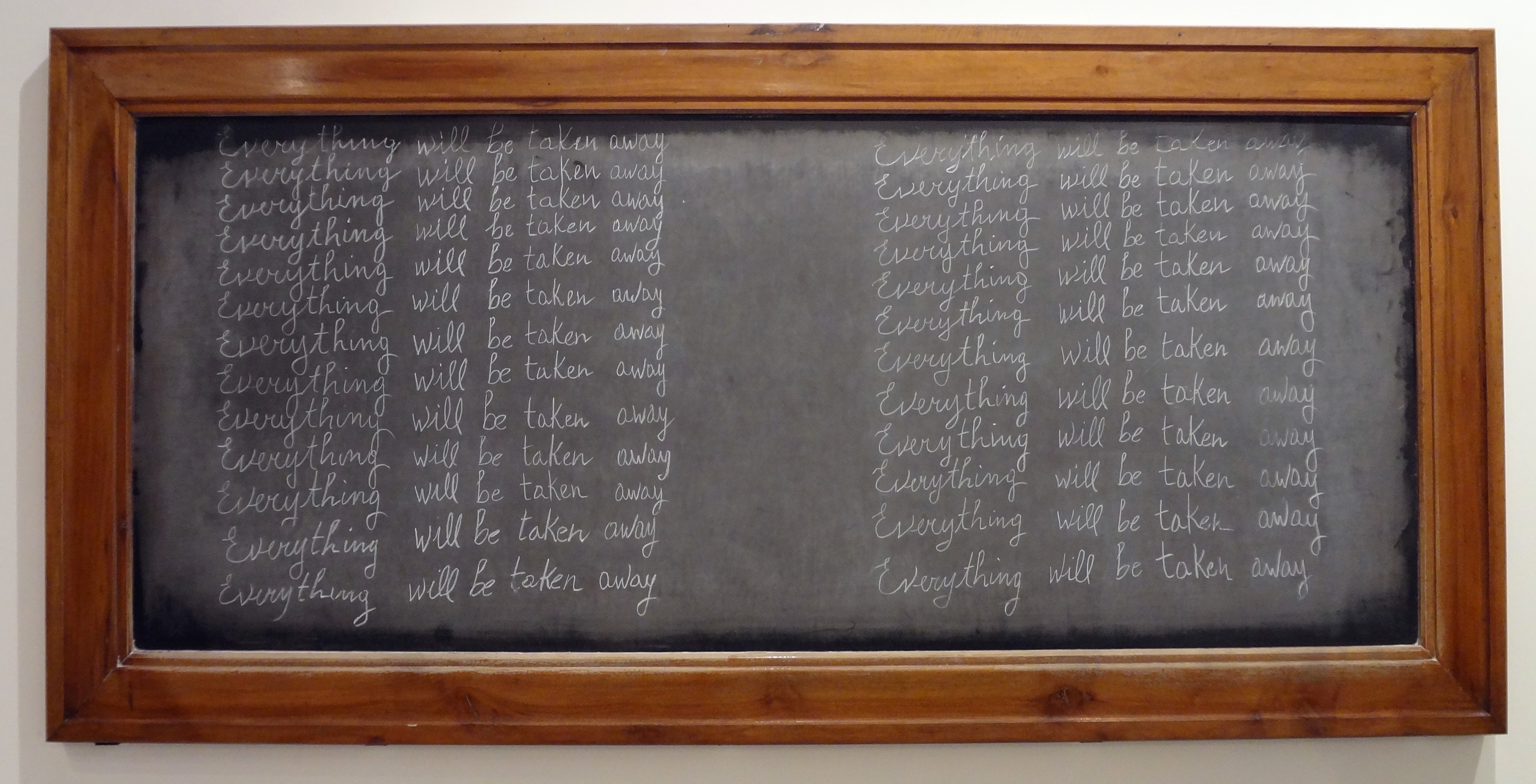 In another room, objects were covered with the words “everything will be taken away” and hung next to a giant photo of the Nazis at their Degenerate Art Show. I was taken, as is often the case, by the way the work effected the audience, or didn’t. You can see in the photo at the top of the post, viewers standing around blankly, while the man on the right talked loudly on his cellphone for the entire time I was viewing at the work. Her ominous prediction sees so much more probable in this setting. After a week of contemplating the theme of All the World’s Futures, I found Piper’s directness on the topic hard to describe as anything less than courageous and superb.